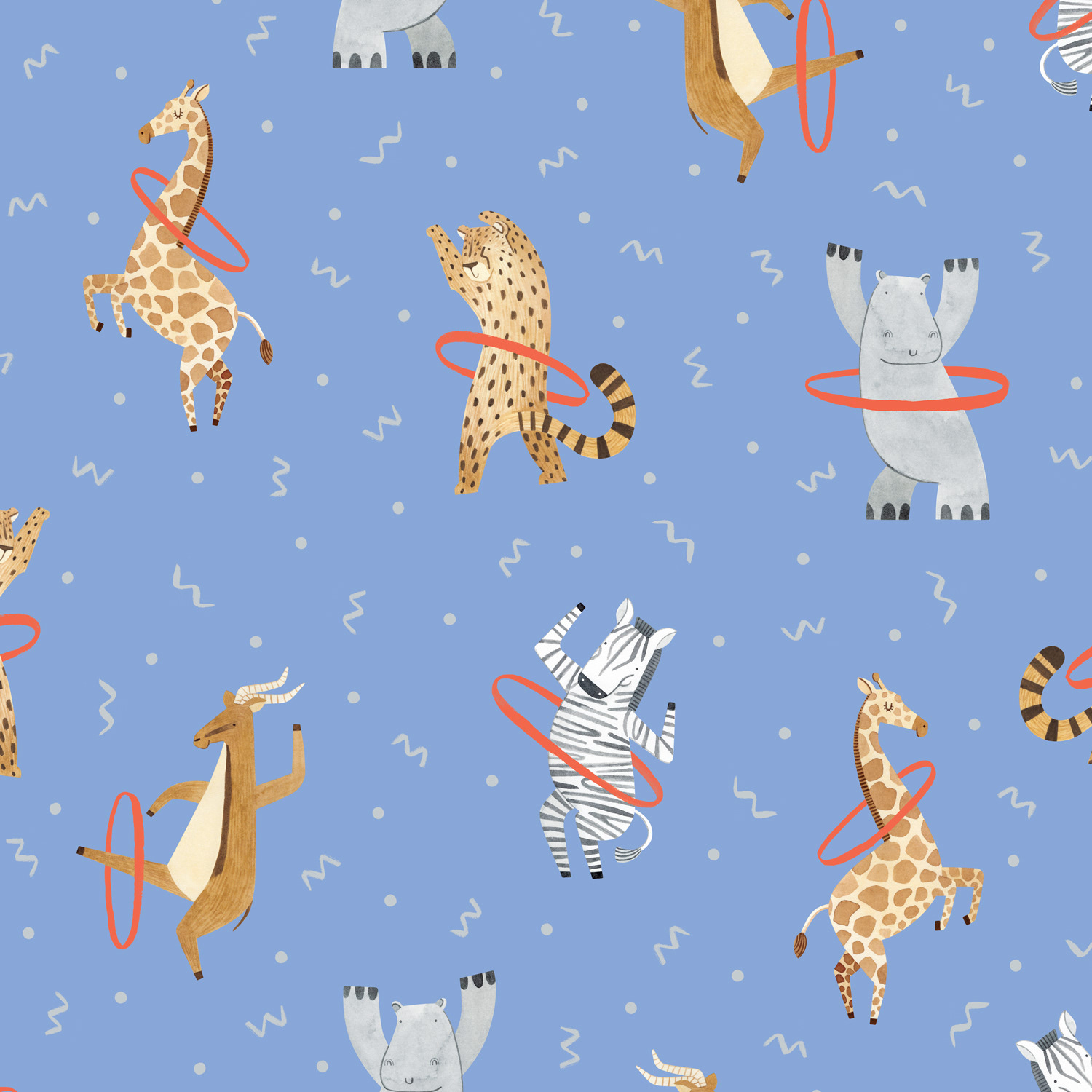 Capsule print collection of animals dancing with hula hoops. Illustrations applied to a positional art print, repeat pattern and greeting cards. Watercolor and gouache. Available for purchasing or licensing.