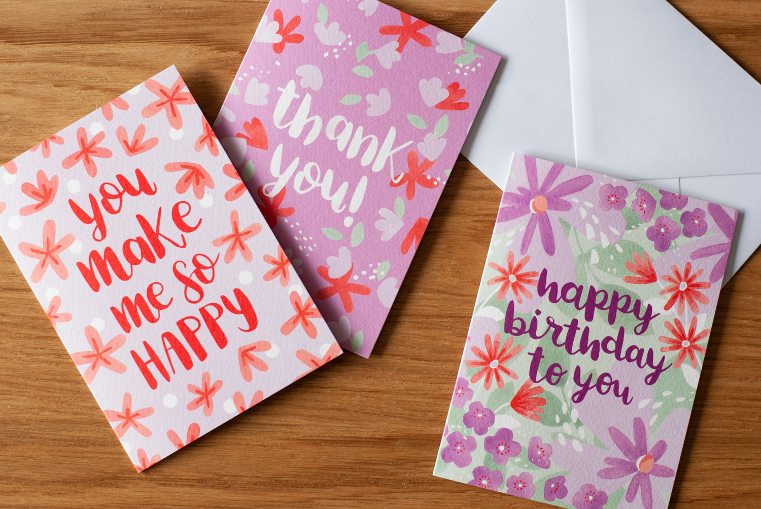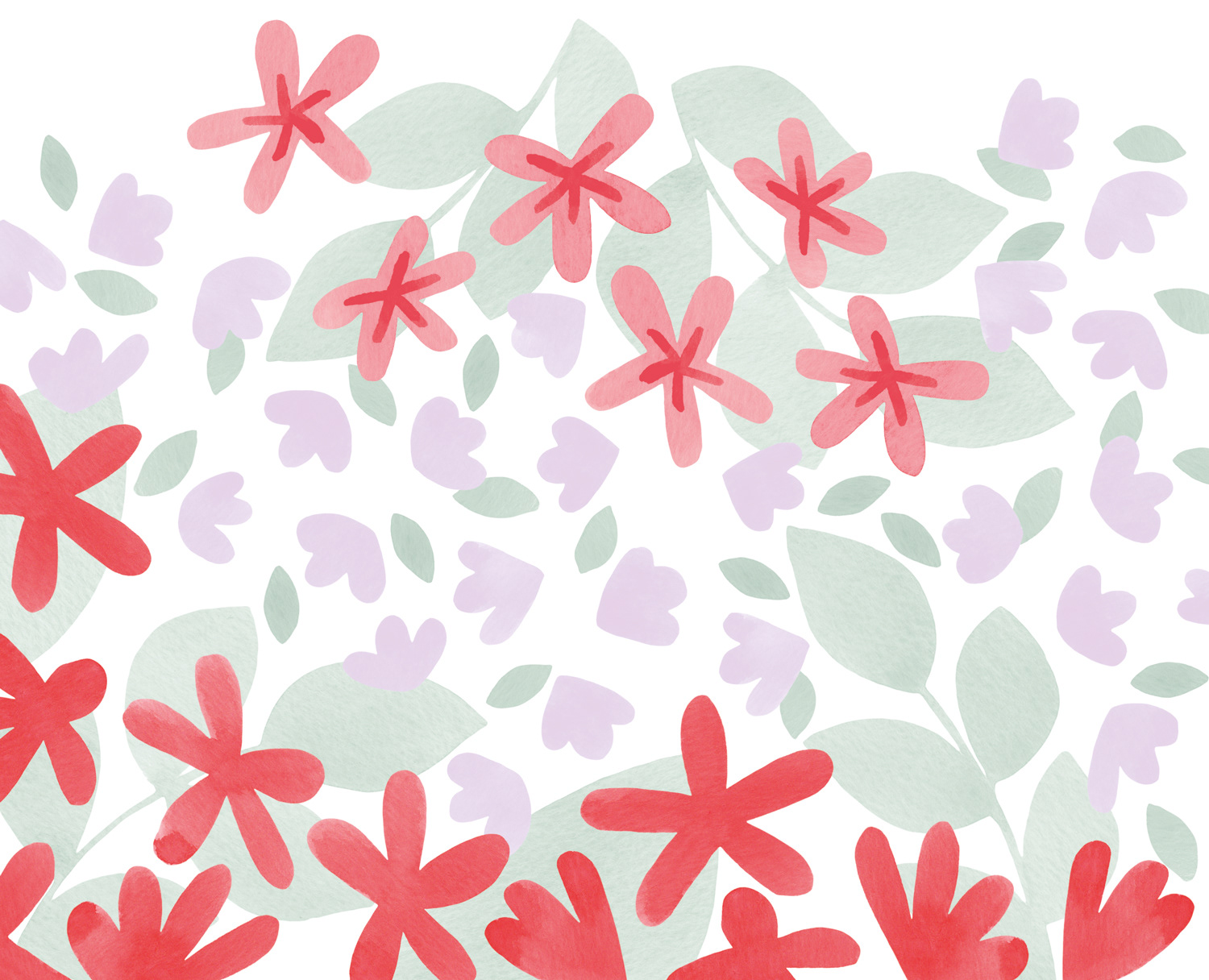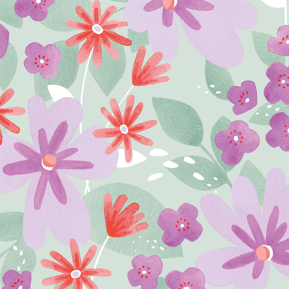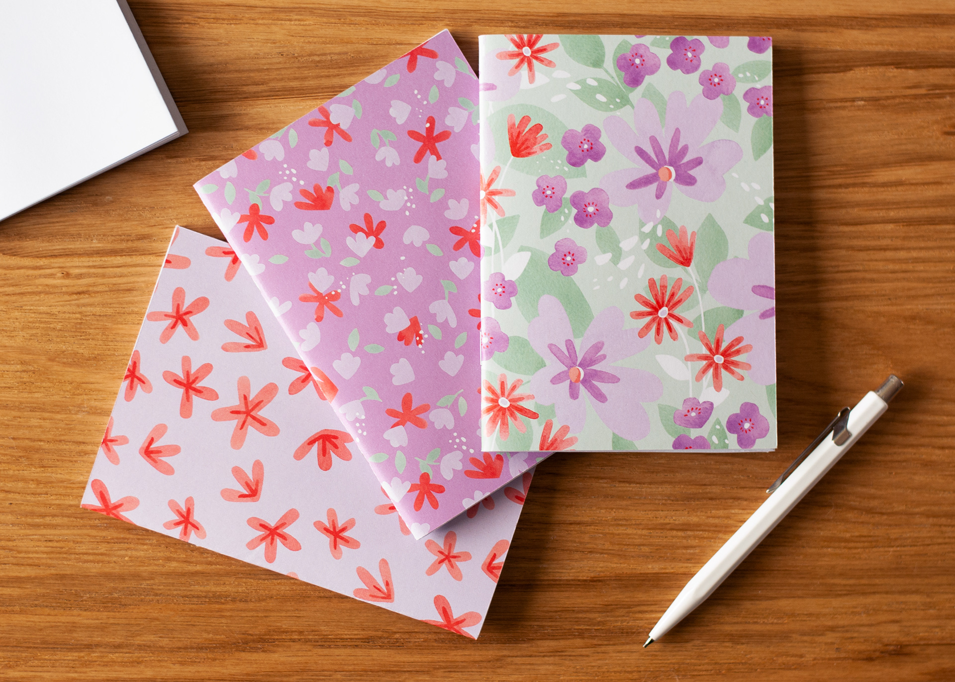 A colour palette inspired this collection. After a study of a broader palette for spring trends, this palette engaged me to do some floral patterns. All patterns and text have been designed from watercolour and gouache paintings. From there, I developed a new paper goods collection, including greeting cards and notebooks.